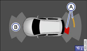 Die angezeigte Grafik stellt die abgetasteten Bereiche in mehreren Segmenten dar. Je mehr sich das Fahrzeug einem Hindernis annähert, umso dichter rückt das Segment an das dargestellte Fahrzeug ⇒ Abb. 145Ⓐ  bzw. ⇒ Abb. 146Ⓐ . Spätestens wenn das vorletzte Segment angezeigt wird, ist der Kollisionsbereich erreicht. Nicht weiterfahren!