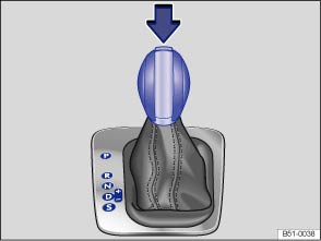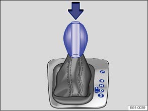 Der Wählhebel ist mit einer Wählhebelsperre ausgestattet. Beim Wechseln einer Wählhebelstellung aus der Position P in eine Fahrstufe das Bremspedal treten und die Sperrtaste im Wählhebelgriff in Pfeilrichtung drücken ⇒ Abb. 134  bzw. ⇒ Abb. 135 . Um den Wählhebel aus der Position N in die Position D oder R zu bringen, vorher das Bremspedal treten und halten.