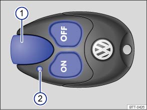 Eine optimale Reichweite wird erzielt, wenn die Funk-Fernbedienung mit der Antenne ⇒ Abb. 165①  senkrecht nach oben gehalten wird. Dabei die Antenne nicht mit den Fingern oder der Handfläche abdecken.