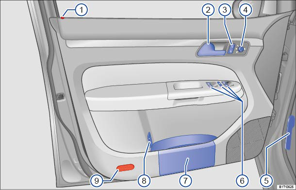 Bedienungselemente in der Fahrertür (Linkslenker). Rechtslenker ist
