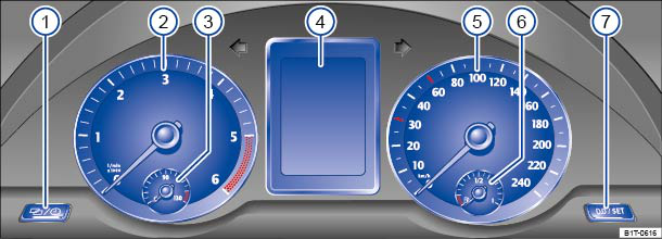 1) Je nach Ausstattung des Fahrzeugs kann die Uhr auch über das Menü Einstellungen im Display des Kombi-Instruments eingestellt werden ⇒ Menü Einstellungen .