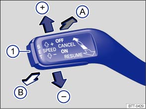 | GRA-Regelung vorübergehend abschalten. | Hebel in Pfeilrichtung Ⓑ in Druckpunkt ![]() ![]() ![]() ![]() ![]()