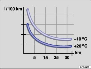 ⇒ Abb. 141  zeigt den unterschiedlichen Kraftstoffverbrauch für die gleiche Strecke einmal bei +20 °C (+68 °F) und einmal bei -10 °C (+14 °F).