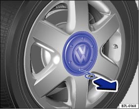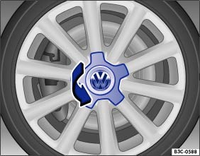 Je nach Ausführung kann die Radmittenblende abgezogen ⇒ Abb. 203  oder durch eine drehende Bewegung entfernt werden ⇒ Abb. 204 .