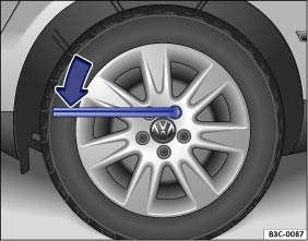Die Anti-Diebstahl-Radschraube muss bei einem Rad mit Radvollblende an Position ⇒ Abb. 208②  oder ③, bezogen auf die Lage des Reifenventils ①, eingeschraubt sein. Die Radvollblende kann sonst nicht montiert werden.