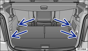 Im vorderen und hinteren Bereich des Gepäckraums befinden sich Verzurrösen zum Befestigen von Gepäckstücken ⇒ Abb. 102  (Pfeile).